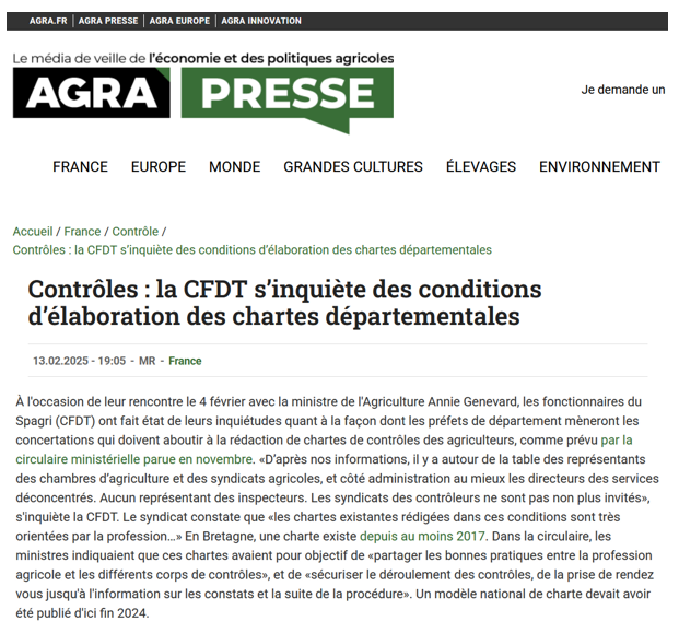 Pour la CFDT, la ministre doit demander aux préfets d’associer des représentants des contrôleurs, à minima les organisations syndicales, et si possible un groupe d’inspecteurs, lors de ces réunions. Maintenant que les élections dans les chambres d’agriculture sont terminées, il est urgent de reprendre la main ! Ce n’est pas à la profession agricole de fixer les règles du jeu en matière de contrôles comme l’a fait le président de la FNSEA en décembre dernier lorsqu’il a appelé à la suspension des contrôles sans recadrage . Il doit y avoir équilibre dans la représentation des agriculteurs et des inspecteurs.