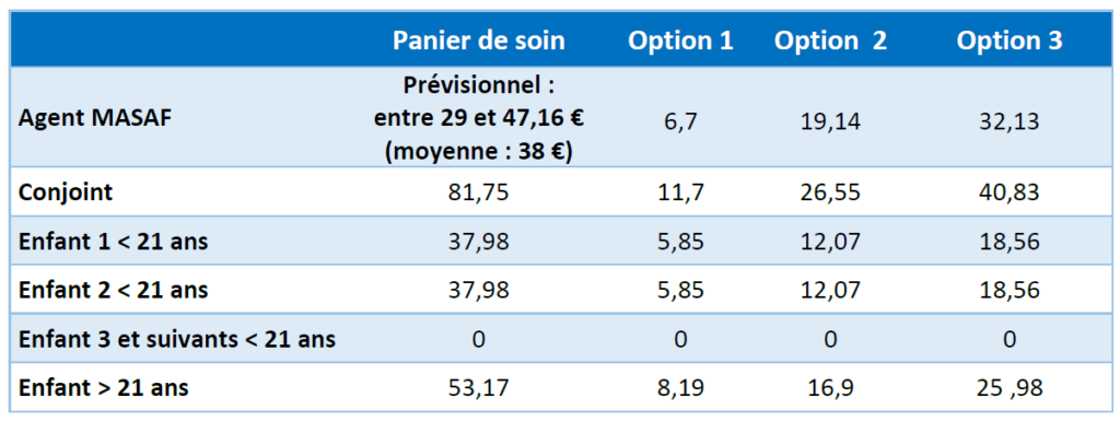 En tant qu’agent du MASAF, votre cotisation sera comprise entre 29,00 € et 47,16 €, avec une moyenne indicative de 38 € par agent, participation de l’employeur comprise.