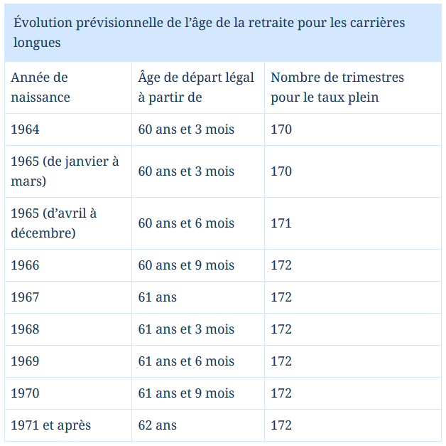Des ajustements spécifiques s’appliquent également aux carrières longues, pour les assurés ayant commencé à travailler avant 20 ans et remplissant les conditions de trimestres cotisés.