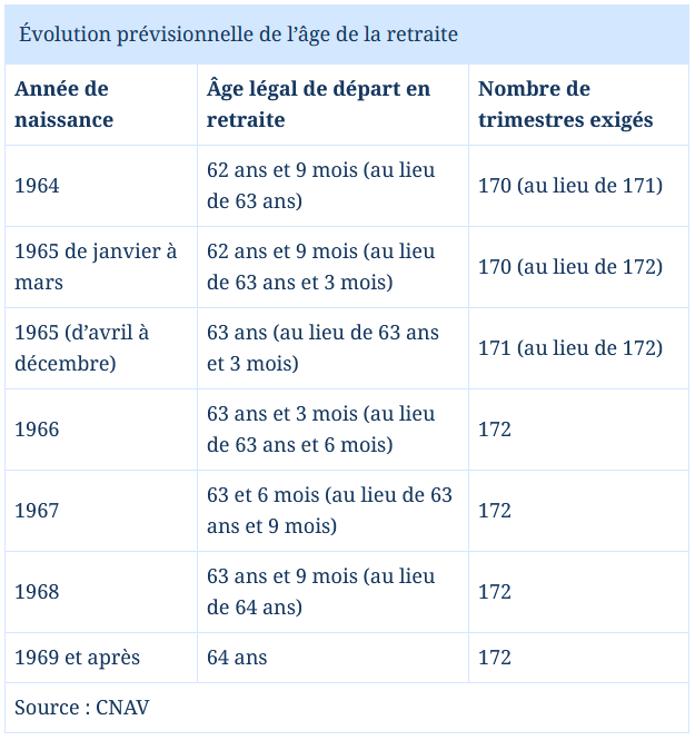 • Une personne née en 1964 pourra partir à 62 ans et 9 mois avec 170 trimestres requis (au lieu de 63 ans et 171 trimestres) ;