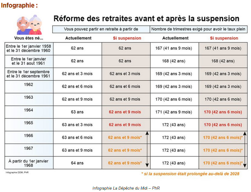 Ensuite, tout dépendra des résultats aux élections de 2027. S’il y a une majorité pour une nouvelle réforme, alors s’appliqueront les mesures qui seront adoptées à ce moment-là. S’il n’y a pas de nouvelle réforme, alors les personnes nées entre le 1er janvier 1965 et le 31 décembre 1968, pourront quand même partir 3 mois plus tôt, quoi qu’il arrive, que ce que prévoyait la réforme de 2023. Cela va concerner quoi qu’il arrive environ 3,5 millions de personnes.