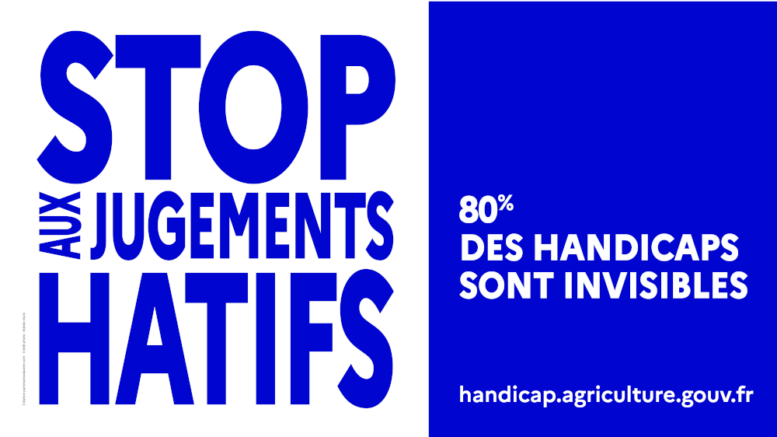 La secrétaire générale du ministère de l’agriculture et de la souveraineté alimentaire, Cécile Bigot-Dekeyser , a annoncé le 3 septembre 2024 le lancement de la campagne de communication et de sensibilisation interne « Stop aux jugements hâtifs ! ». Cette campagne débute alors que les Jeux Paralympiques de Paris 2024 sont en pleine effervescence et font la démonstration de tous les potentiels des athlètes engagés.