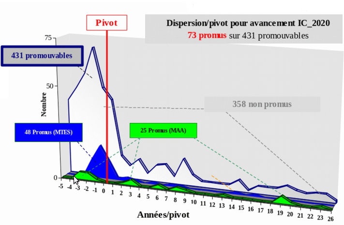C’est sur ce dernier point que nous voulons attirer votre attention. L’édition, ci-dessous, des courbes de répartition des populations d’IPEF promouvables aux grades d’ingénieur en chef et d’ingénieur général de classe normale est édifiante.