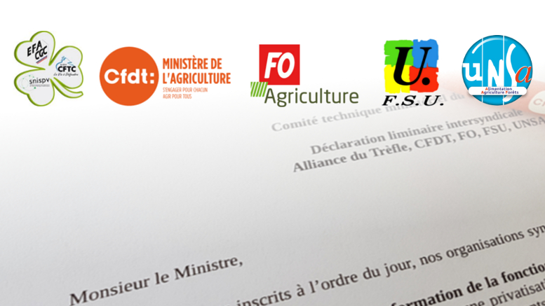 En préambule de ce CTM, l’Alliance du Trèfle, la CFDT, FO, la FSU et l’Unsa ont lu à Isabelle Chmitelin, directrice de cabinet du ministre de l’Agriculture, la déclaration liminaire intersyndicale reproduite ci-dessous.