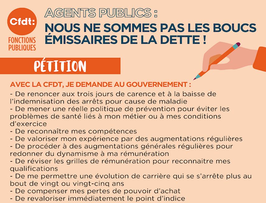 Sans confusion possible avec d’autres mobilisations sectorielles, les équipes CFDT construiront les formes d’actions les plus appropriées à chacun de leurs secteurs et territoires. Après avoir obtenu que le ministre reçoive les organisations syndicales représentatives de la Fonction publique, qu’il renonce à la suppression des catégories et s’engage à ouvrir des concertations, la CFDT est pleinement engagée pour améliorer le pouvoir d’achat et les conditions de travail dans l’intérêt des agents et pour une fonction publique mieux reconnue et plus attractive.